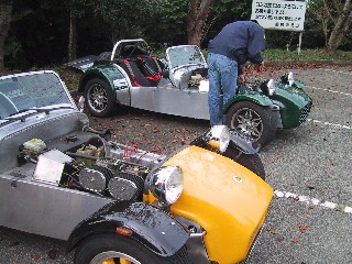 山上に上がるともうNISHIさんの7は来られてました。 仲間の7さんはキャブを調整されてます。 |