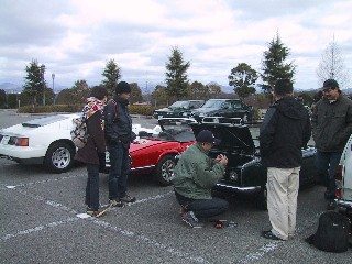 | …という事でみんな無事到着しました。 | TAKAさんのエスロクにみんなが集まってきました。 右テールレンズのバルブが切れてしまったようです。 TAKAさん、早速ばらしておられました。 |