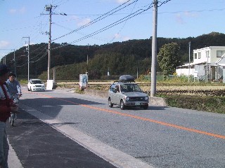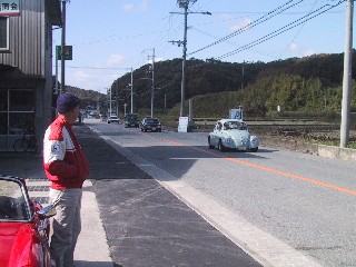 | ちょっと早周りをして南商会さんでみんなを待ち伏せ… 先頭はTAKUさんのホンダライフ!(もちろん360cc) |
