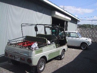 ガレージに戻るとtakuさんが来られてました。 バモスも幌全開!秋のオープン気分です。 |