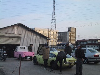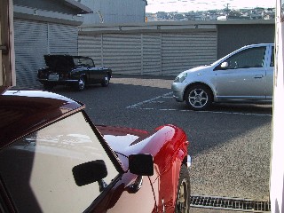 ガレージにて… 約一ヶ月位のドクターストップもすぎて 何とか車を動かすリハビリ! スピットで参加する事に決めました。。 ガレージではエスロクTAKAさんが待機中。 少し待ってもらっていつものランデブーです。 |