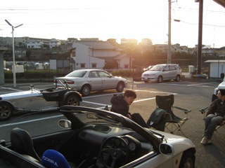 夕方、Satoruさんがガレージまで来てくださいました。 ガレージに戻ってきたM君と一緒に 夕焼けティータイムでくつろいでいます。 |
