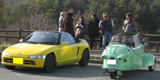 | OBC仲間のM君の黄ビートの横にはFUKUさんのメッサーシュミット・久し振りですね〜 その後ろで仲間が集まって楽しんでいます。 |