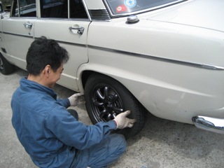 | TAKUさんが出来上がったN360の引取りに来られるとの事。 アモンの会場をあとにして、さらに西へ向かいました。 ちょうど54BのIKEさんとお会いしてそのまま到着。 今回はアルミ・タイヤの交換となりました。 てっちんホイールから渋めのアルミに変更です。 |