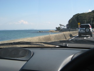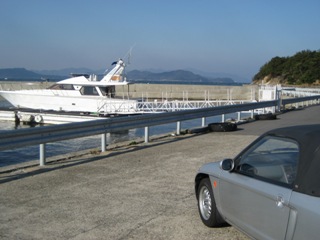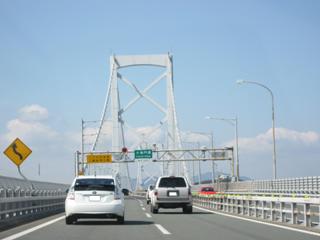 | 途中から屋根を開いて、そのまま南へ向かいます。 予約している宿近くの港にちょっと寄り道…鳴門大橋がすぐそこであります。 |