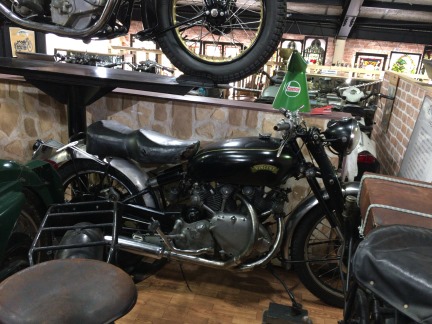 | こちらも好きなバイク2台 インディアンのストレート4とヴィンセント・ブラックシャドウです(^_^)。 帰り間際に岩下さんにお声を掛けて頂きました。いろんなお話もお伺い出来て、楽しい見学になっています。 さぁ、そろそろ熊本まで走りますよ〜 |