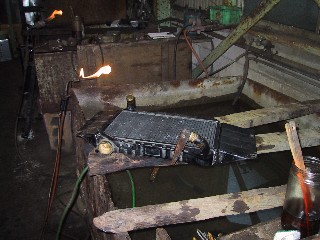 | ラジエターの取り付け部…振動で溶接が外れてしまいました。買ったときに修理したんですが…(^_^;) 左はボルトを緩めるとこんな状態(>_<)。 右も上側が外れていた為、自分で修理する事を断念。 夕方、知り合いのラジエター屋さんに走っていきました。 |