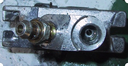 | エアー抜きの最中に右シリンダーの結合部からオイル漏れ!! 原因はこいつでした。 よーく見て頂ければ分るのですが新品の生産ミスのようです。 シリンダーのテーパー状の結合部の穴の位置がずれているのです。 仕方ないので外したシリンダーのボディーを使い シリンダーピストンを新品から外して組み付け…もう一度一から組み直しました。 あ〜しんど!! |