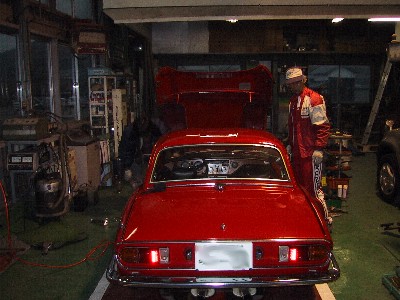 クラッチのマスターシリンダーを交換する頃は もう日が暮れて夕方に! 時間が無く今回はレリーズシリンダーはそのままで 漏れていたマスターのインナーだけを換える事にしました。 分りますか? 左の紺ジャンパーで作業してるのが管理人KAZUです。 (本邦初公開…撮影は遊びにいらしたTAKAさんです。) |