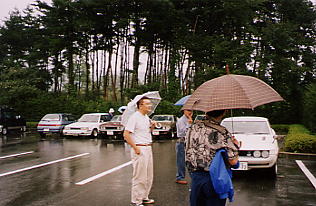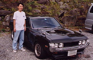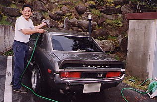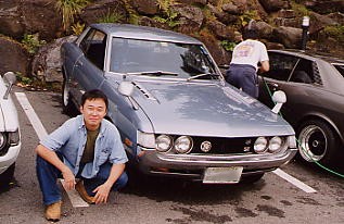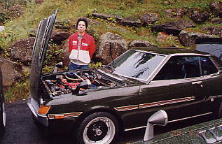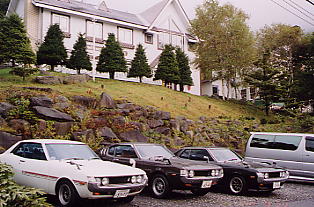 | 朝は6時に目が覚めました。 同室のKOUさんの寝言が心配でしたが(^_^) 何とかゆっくり休めました。 ペンション二階からセリカを見下ろします。 「アァ…カッコいい!」 何とか雨も上がっています。 |